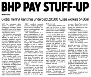 BHP has admitted that since the National Employment Standards were introduced in 2010, almost 30,000 workers have been affected by having annual and/or sick leave incorrectly deducted. BHP say they owed each affected worker an average of six days’ leave due to incorrect poor payroll practices.
