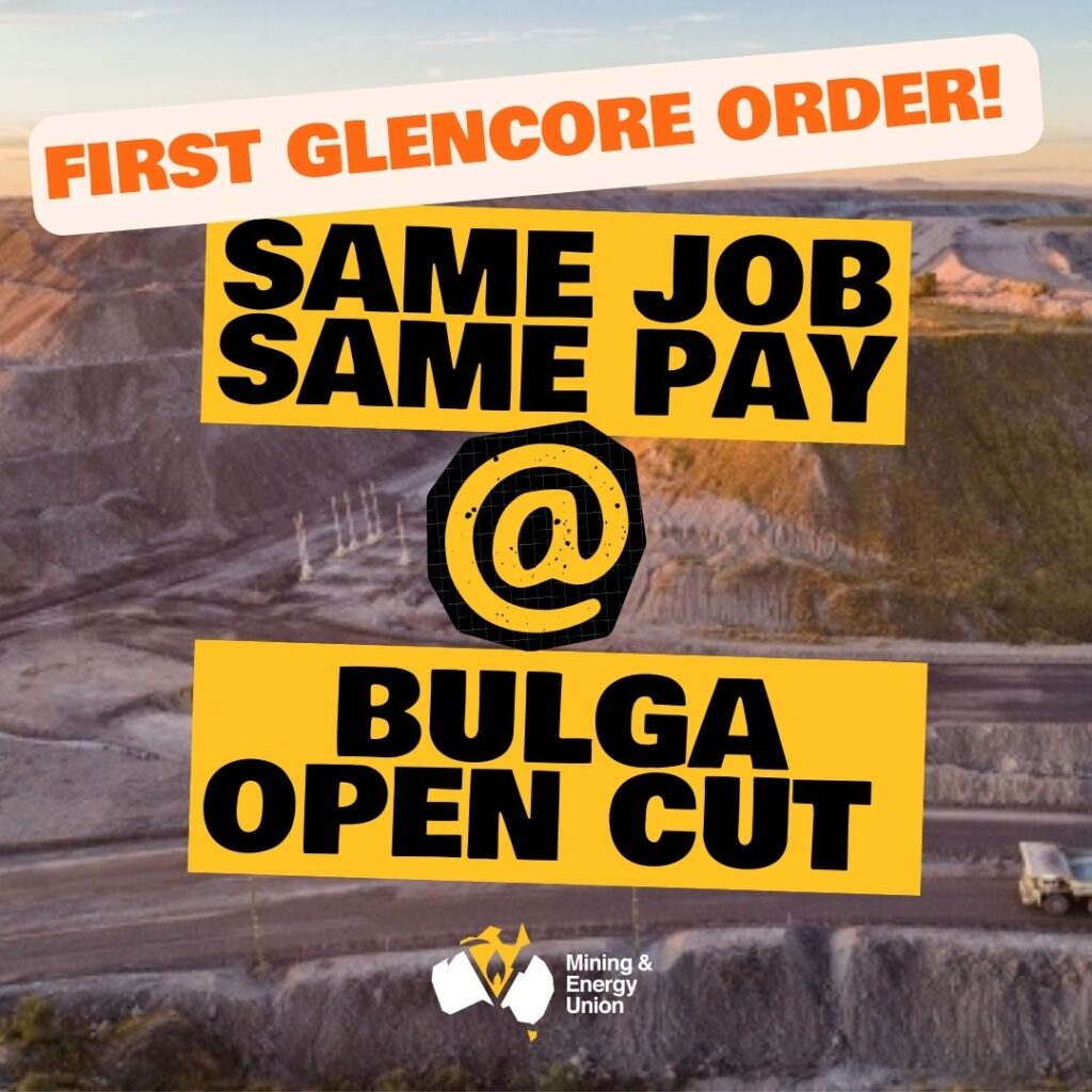 Same Job Same Pay applications are still before the Fair Work Commission at Glencore sites Mt Owen/Glendell, United Wambo, Hunter Valley Operations, Ravensworth, and Mangoola.