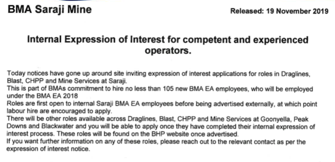BHP has done everything possible to cut permanent EA jobs and replace them with casual labour hire and now Operations Services, on lower pay and conditions. But union pressure has delivered new EA jobs at BHP Queensland mines, starting with Saraji.