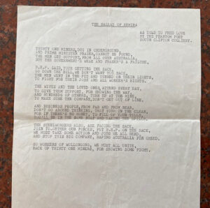 Fred was an active and committed member of the Miners Federation. He was known as the ‘phantom poet’ of the coal industry, who could use words to great effect. During the 1982 Kemira Dispute he penned “The Ballad of Kemira”, which stands as a powerful and poetic description of the sit-in.